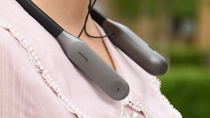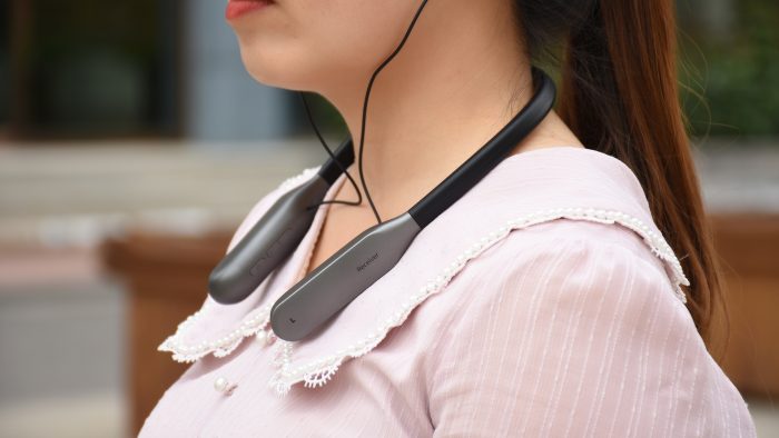 先来说说耳机,外观和前几年热门的挂脖式运动耳机很相似,不过由于耳机中内置了更大的电池和专业的信号收发芯片,两边仓体因为使用了演出级别的UHF无线技术所以要比运动耳机大一些。配色采用灰色和黑色拼接,显得低调内敛,不张扬,毕竟在直播的时候首要关注点是主播和要展示的产品,直播耳机不是主角,太过抢镜就不好了。