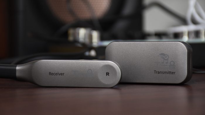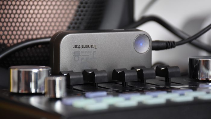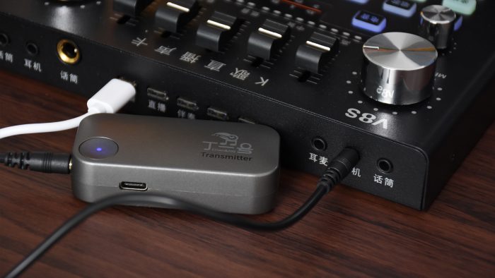 拿它当做监听耳机完全不影响之前的设备布局,只需要把原来用的有线监听耳机从声卡上拔下来,用附送的3.5毫米线材把发射器和声卡的监听接口连接起来就可以了。耳机和发射器在出厂的时候已经做了配对,两者都开机以后无需操作即可自动连接,指示灯变为蓝色常亮表示连接成功,现在就可以用它来直播了。
