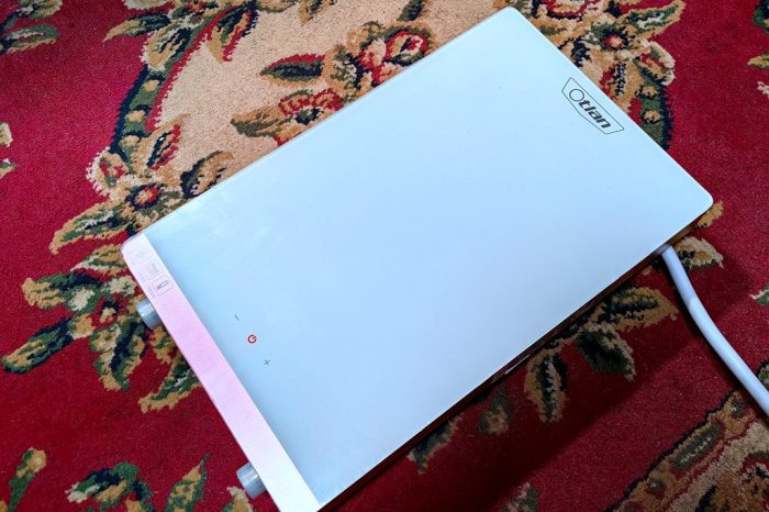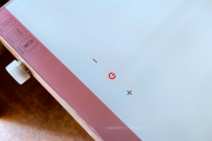 热水器采用触摸操作,在下方位置拥有开关和温度加减按键,按键上方还设计了隐藏数显,用来指示当前温度。