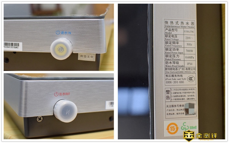 机身四周采用了表面拉丝处理,质感很足。侧面有产品型号、功率等内容,值得注意的有两个地方:一是它的最高功率达到7KW,二是防水等级是IPX4,我们日常冲澡是不小心喷洒到它上面,是没有问题的。