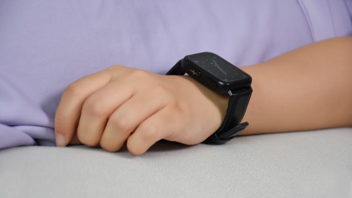 手环中框采用铝合金材质,表面辅以细微的黑色磨砂质感,很显大气,也不容易沾染指纹。右侧分布有电源键和电极模块,测量心电图的时候需要将手指和电极模块贴合。