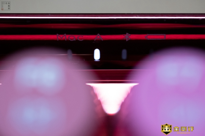使用时,通过正面顶部的四个指示灯,我们可以清楚分辨键盘的状态,这里有Mac指示灯、大小写指示灯,蓝牙指示灯和电量指示灯。这个键盘可以同时连接5个设备,只需要用FN+1/2/3/4/5的快捷键,就可以直接在5台设备之间切换,简单又直观。