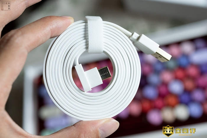 打开包装,里面除了必要的键盘、说明书和2.4G无线接收器,还有一根白色的数据线,线材很结实,接头部分是L型的,可以和键盘接口的导轨相配合,避免线材被拉扯损坏,延长使用寿命。