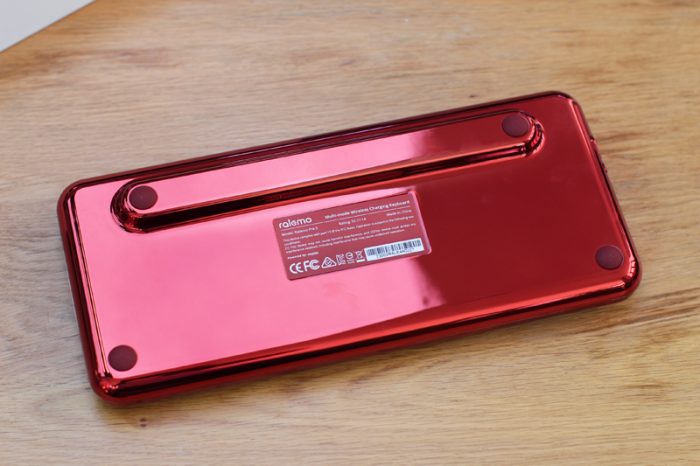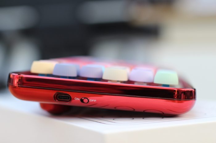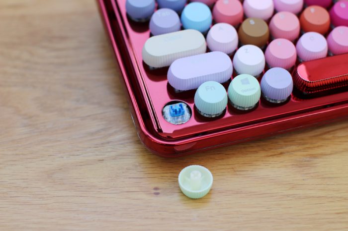这款键盘是79键布局,体积也相对小巧,但是整体的用料却很扎实,并且重量达到了773克,拿到手里沉甸甸的,这的确让人很意外。79个按键的颜色各不相同,加上圆形的百褶键帽和胭脂红的炫酷金属光泽,真的是熠熠生辉。