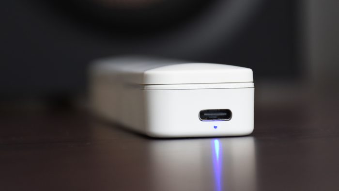 盒盖内侧标注有收纳仓的电池容量、充电功率和制造商信息。收纳仓较窄的一侧预留有Type C充电接口和充电状态指示灯。