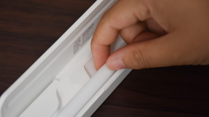 向上揭开收纳仓,西圣Pencil触控笔放在模具中,模具一侧还预留了扣手的位置,可以把手指放进去抠起触控笔,细节设计一定要给个好评。