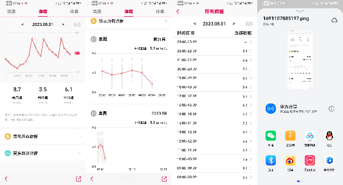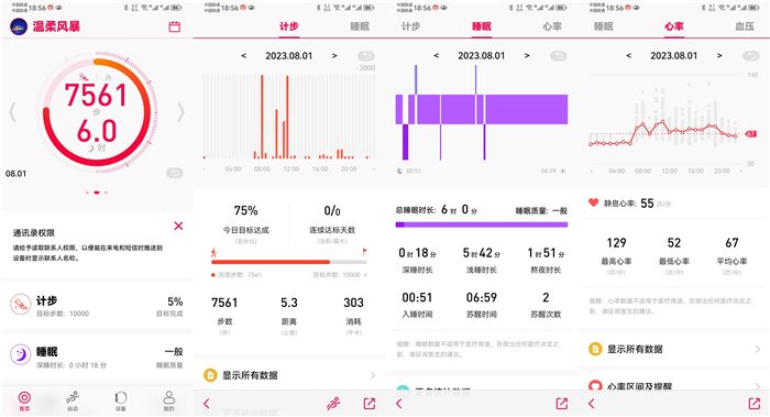 在各个分系统菜单中,有着更为详细的每日、每周和每年的数据统计和分析图标,可以定期对运动步数和能量消耗累计值与自己设定的目标进行对比,以便激励自己及时调整运动量。通过睡眠监测数据,调整睡眠时间,根据血压、心率统计图表,能够轻松的发现自己的血压、心率、血糖和睡眠质量等变化规律和异常数据,比起间断的单次监测检查,能够更加科学系统的反映身体指标,起到预警身体状况变化的作用。