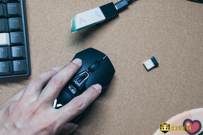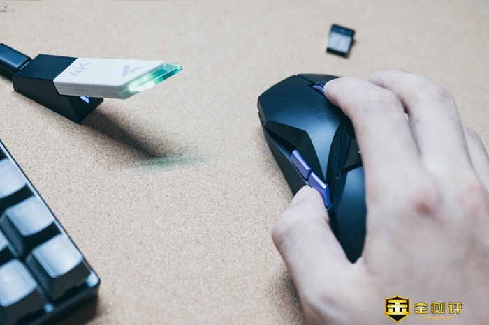 前面提到雷柏VT950Pro能支持4KHz回报率,这个前提是更新固件,然后配备雷柏专门的4K无线接收器V2M,和鼠标配对好之后,就可以让回报率从1000Hz飞升到4KHz,响应时间缩短到0.25ms,和有线鼠标不相上下,在4K显示器上玩得更爽。