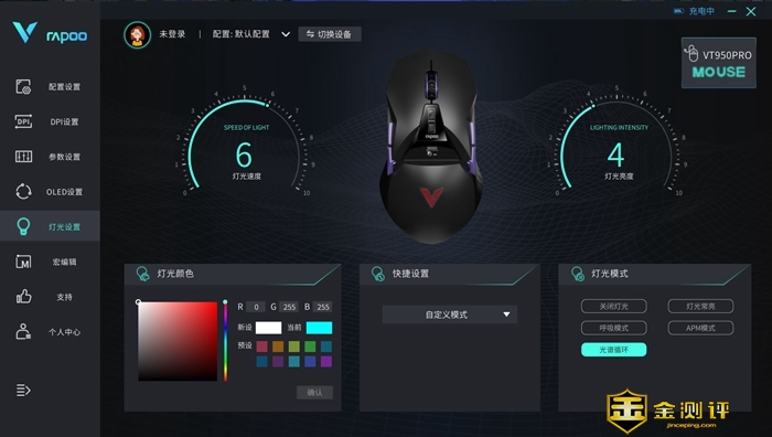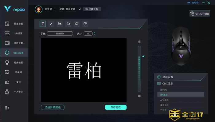 细节部分,雷柏VT950Pro最抢眼的应该就是这块OLED屏显了,这块屏幕支持自定义显示内容,可以选择DPI等参数,也可以自定义文字图案。在掌托部分则是配备了一颗雷柏标志的RGB灯,有1680万色,还提供了丰富的灯光模式可以选择,日常使用中也可以用来提示鼠标电量高低。
