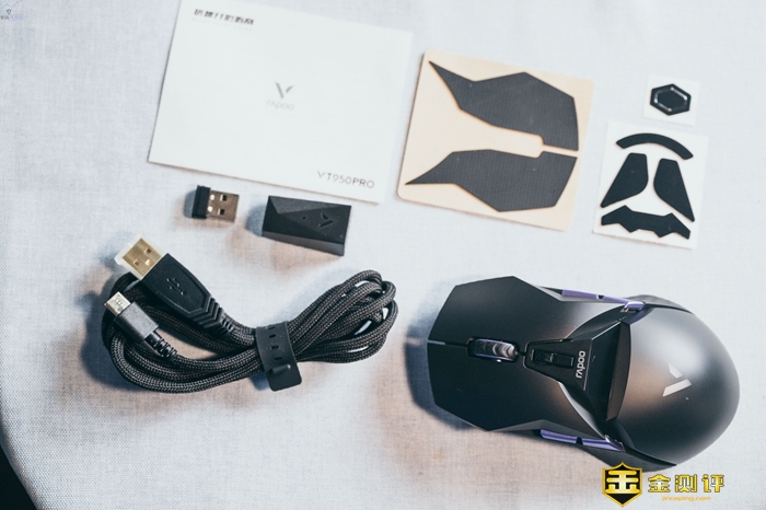 鼠标盒子里的东西十分丰富,不只是基础配件,除了鼠标本身,还有产品手册、编织数据线、2.4G的无线收发器、USB转换器、可以换的脚贴和鼠标防滑贴,使用非常灵活,还能够带来更好的手感。