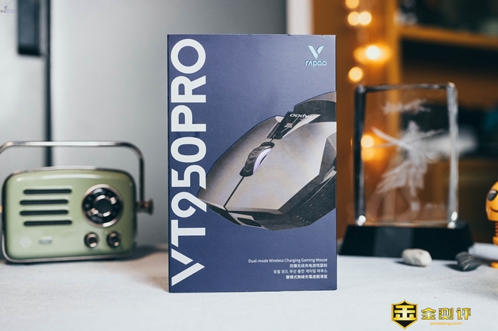 雷柏这一系列的键鼠等配件,包装都是一致的风格,VT950Pro也不例外,主色调是藏蓝色,鼠标的大图占据了正面,再加上型号名,看起来非常精致。背面就是常规的介绍,列出了鼠标的各种功能特点。