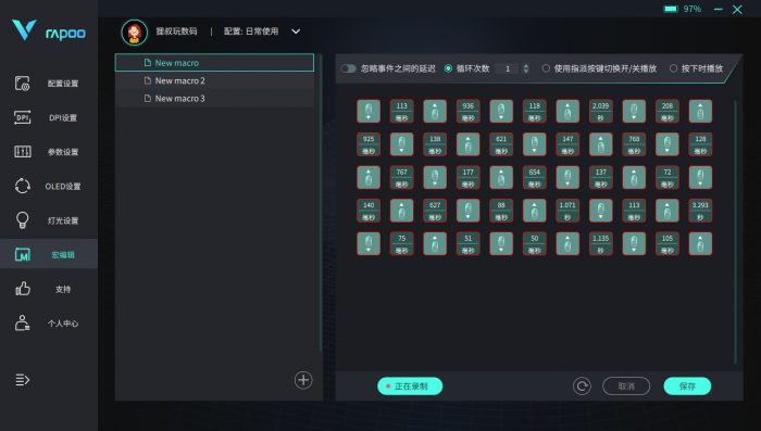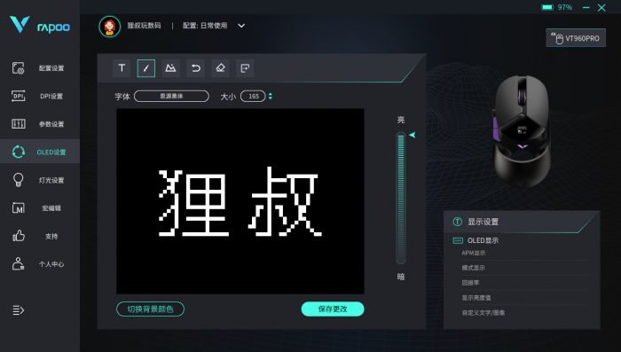 OLED客制化屏幕是这款鼠标的点睛之笔,它可以实时显示自定义文字、图片或者性能参数等。你可以将自己喜欢的图片转换成BMP格式,选择素材的时候尽量用黑底,这样显示的内容可以全贴合显示,效果更佳。如果你玩的游戏需要大量点击鼠标操作,可以试试宏编辑录制功能,录制相应的动作后就能重复执行该操作,蛮实用的。