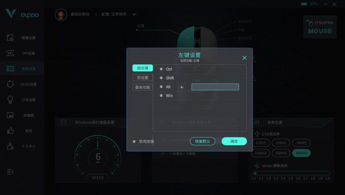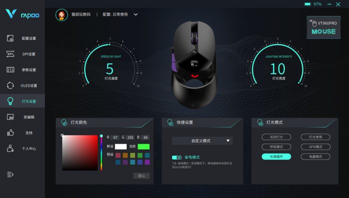 安装完“RapooGameDev”驱动程序,可以对雷柏VT960PRO屏显双模无线游戏鼠标进行个性化设置,像DPI、参数、OLED屏幕、灯光和宏编辑都支持自定义编辑。灯光设置里面可以对LOGO的灯光颜色、切换速度、亮度以及灯光模式进行自定义设置,我觉绿色和蓝色都挺不错,你最喜欢哪种颜色呢?