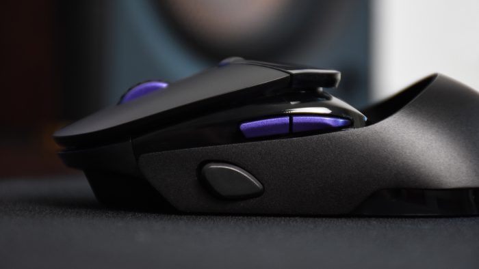 鼠标左右两侧虽然没有真正意义上的侧裙,但正常握持的时候手指和两侧的金属部分贴合,细腻的磨砂质感触感很舒服,还有些凉嗖嗖的感觉,夏天使用正合适。左侧预留有前进后退快捷键,靠前方还有一枚“火力狙击键”,在玩FPS游戏的时候可以一键调低DPI。
