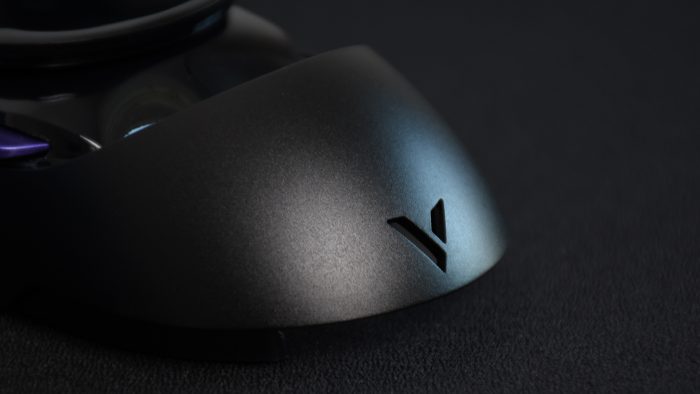 鼠标尾部是一体成型的金属掌托,深黑色表面辅以哑光质感,靠近下方还设计有镂空的雷柏V字形LOGO,起到装饰作用。