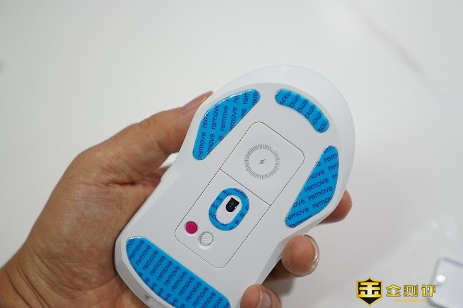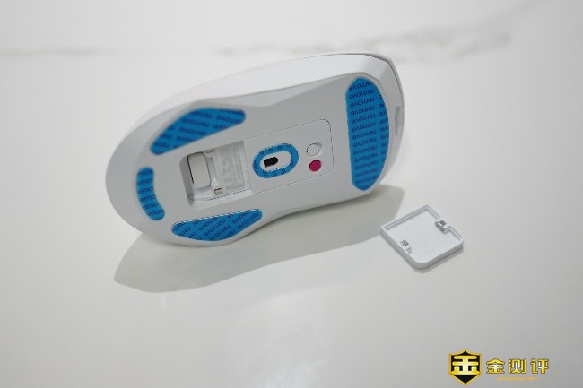 鼠标底部是拨动开关,中间位置是传感器,打开磁吸式的圆形底盖可以看到2.4G无线接收器的收纳仓,以及充电模块扩展仓。