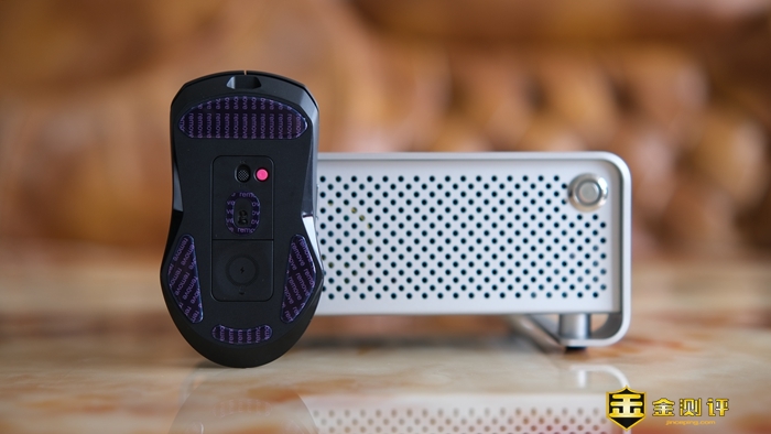 鼠标机身底部中部为光学传感器,是原相高级定制版的3395光学传感器,支持11档静默高度、50-26000DPI调节,预设400、800、1200、1600、3200、6400、26000七档DPI,个人常用1200和1600两档,至于大家喜欢哪个方案,还要看各自的应用环境。