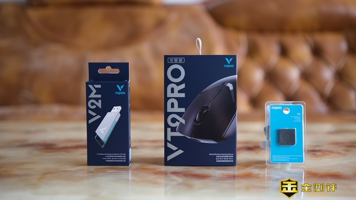 雷柏VT9Pro鼠标外包装延续了自家的经典风格,型号铺满包装左半边,与渲染图穿插出强烈的立体感;另外两个包装分别为选装的V2M接收器和P3无线充电模块,与鼠标自身搭配起来可以提供4KHz回报率支持和更便捷的充电选择。