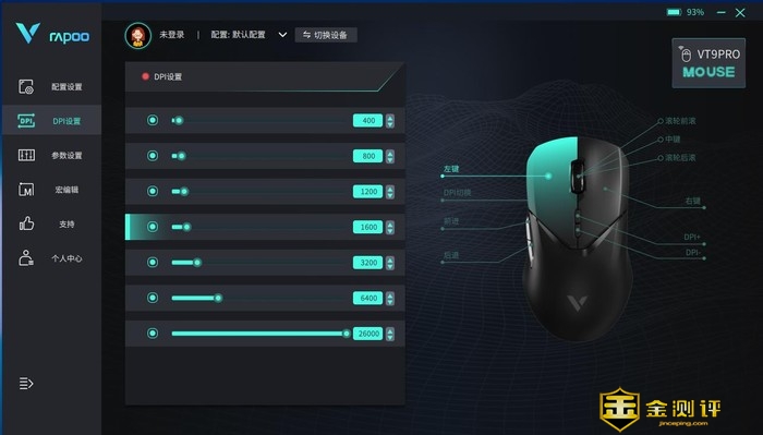 如果想要使用更加丰富的功能,就需要安装雷柏VT9 PRO鼠标官方配置的专用程序。程序从官网就可以下载安装并提供全中文的支持。程序中的提供了完善的调节功能,包括鼠标的按键切换,更加精细的DPI调节等功能的调节。并可以通过宏设置可以将一组繁杂的操作设定在一键中,不仅限于鼠标的也包括键盘的操作。在宏定义中厂家内置了多款主流游戏的常用操作,并可以自定义设置,还支持导入导出。