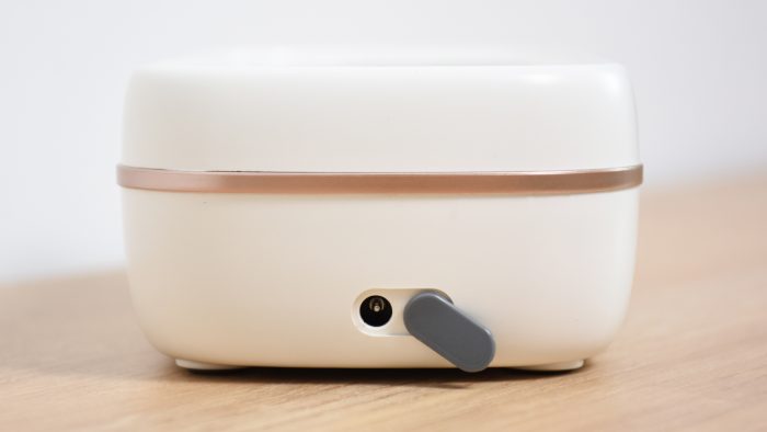 清洗机的造型比较复古,外壳以乳白色为主,中间搭配一圈铜色的腰线,整体看起来十分精致,甚至可以当做一个精美的桌面装饰。机身体积不算太大,三围尺寸分别是220*102*70毫米,摆放在桌面上也不会占用太多的空间。