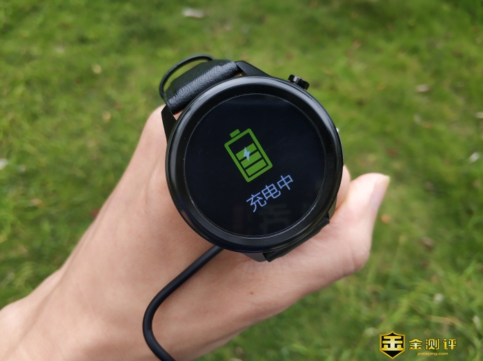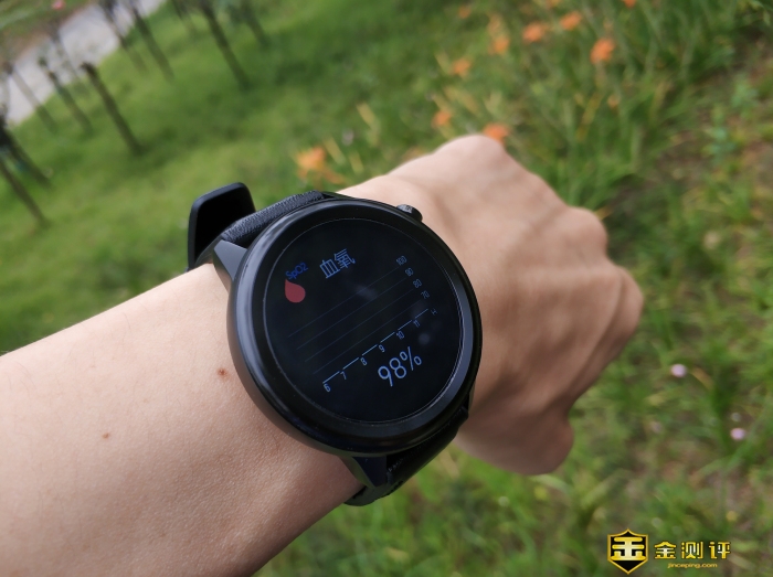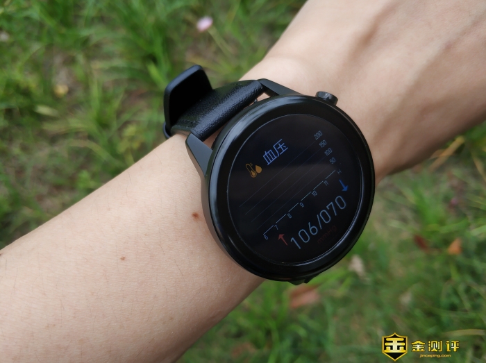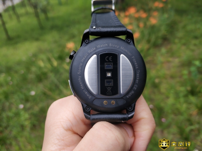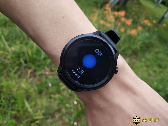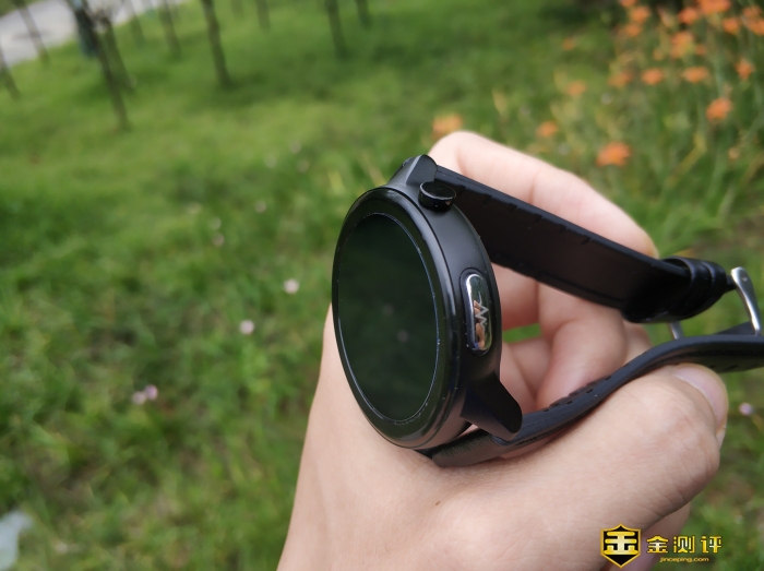 实体键位于右侧,可实现开/关机、返回等操作,还有个ECG金属电极,用于获取心电信号,上面还印刻了心律波的图案,便于快速识别其功能。实际操作也简单,需要测心电时,将一只手佩戴好手表,用另一只手的手指按压此处即可。