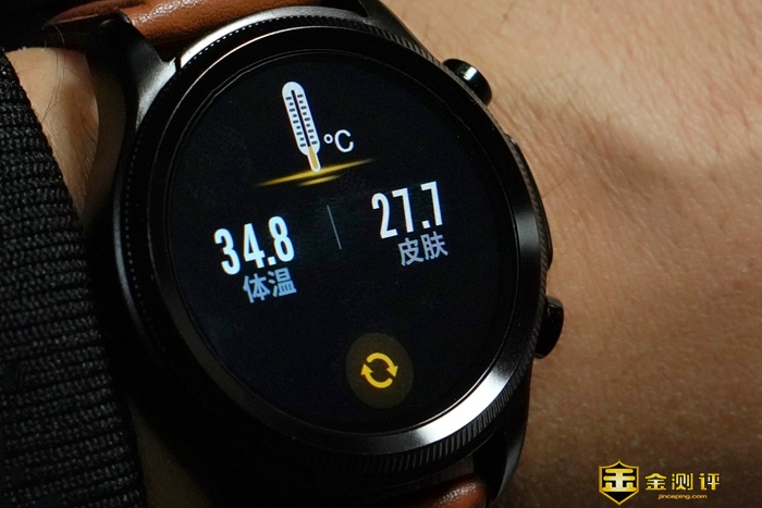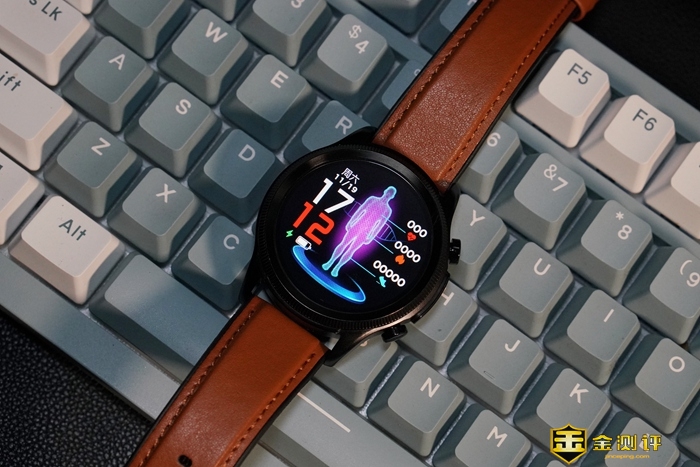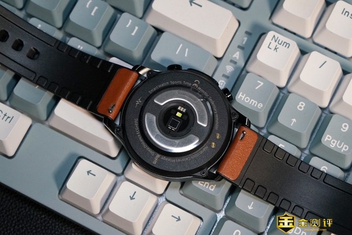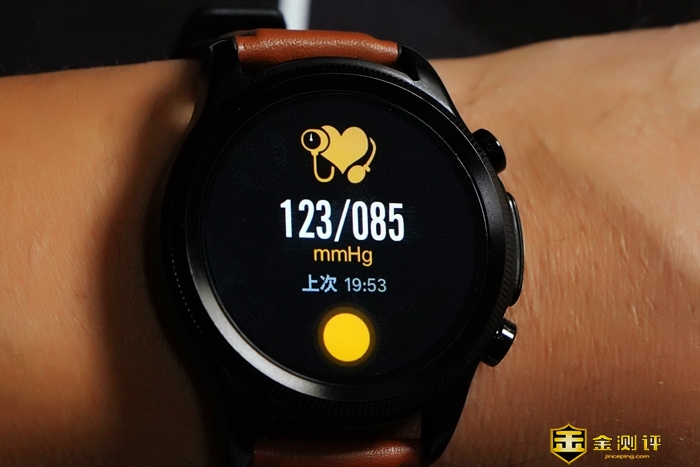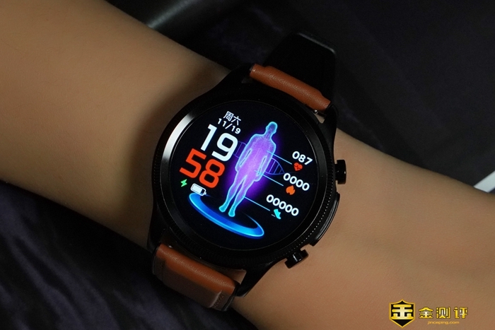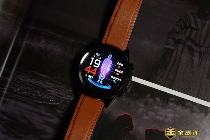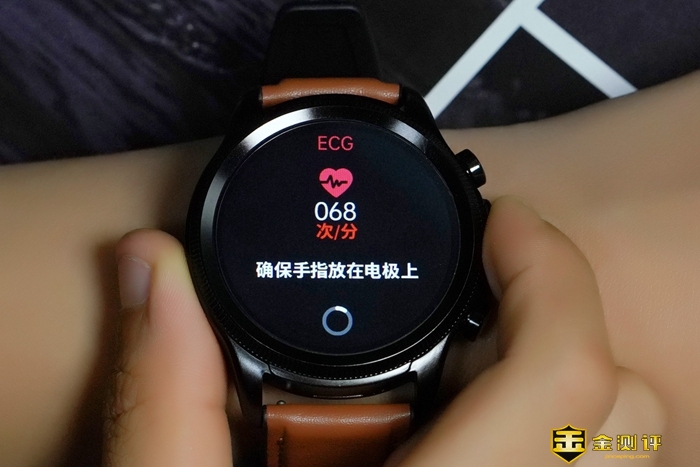 表盘周圈拥有刻度花纹装饰,增添了手表的整体质感。右侧设计有电极键和上下两颗实体按钮,按键回弹力度适中,电极键则是我们进行ECG心电检测需要用到的,稍后会为大家详细介绍。