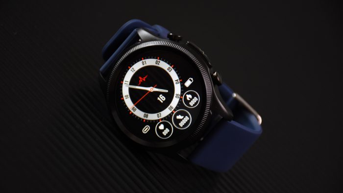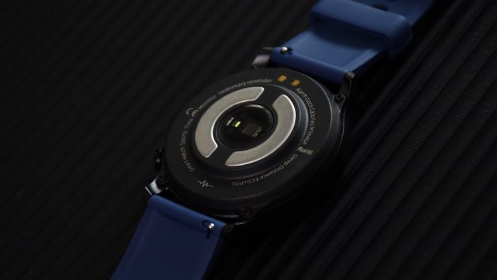 背部也属于中规中矩的配列,中间有两片半环形电极和心率传感器,整个模块微微凸起与表盘背部,目的是佩戴以后和手臂贴合更牢固。靠上方预留有两颗金属充电触点。