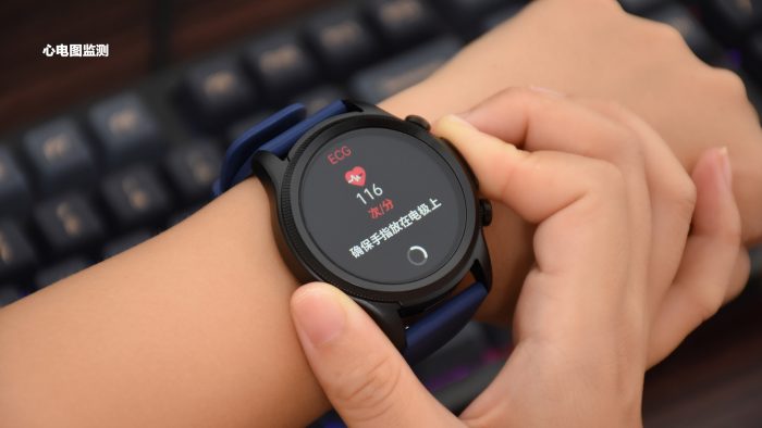 另外,dido E55S Pro还支持ECG心电规律性评估,只需要将手指紧贴表盘右侧的电极模块,它就会从多个维度收集心脏电信号,大约30秒左右生成ECG波形图,并同步到手机APP。通过ECG波形图能够分析出心率、QT期间和HRV三项数据,快速了解心脏大致的健康情况。