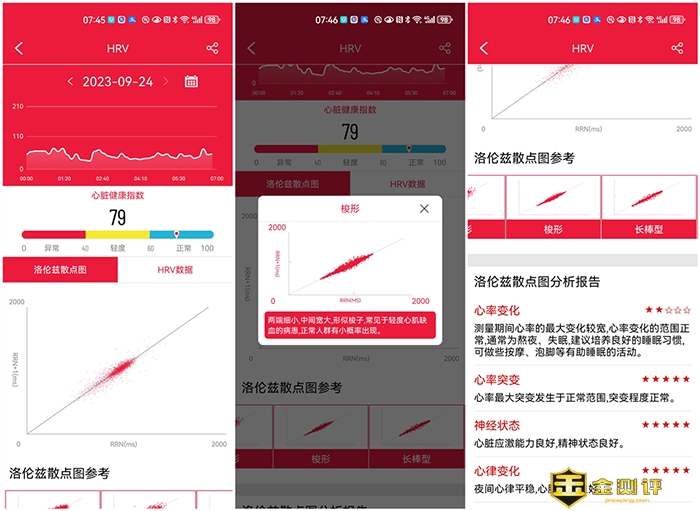 在实际体验中,夜间HRV监测也非常重要,这个会夜间睡着,心率慢下来的时候捕捉心脏跳动的小变化,它反映自主神经系统活性和定量评估心脏交感神经与迷走神经张力及其平衡性,APP会自己诊断心脏是否健康,也可以通过洛伦兹散落点形状,让我们更了解自己的心脏健康,异常类型以及对应的生活建议。