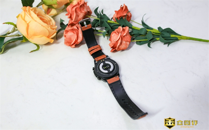 这款智能手表配备了充电线,在表盘背面的上端,两个金属触点是充电接口。