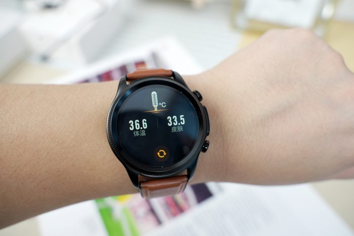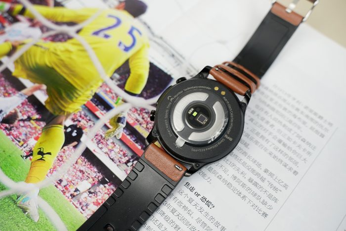 手表背面除了磁吸充电触点,还设置了两片电极片和超高精度的健康监测传感芯片,高品质的芯片配置,也保证了通过传感器在实现心率、血氧、体温等监测,无感血压血糖风险、ECG、睡眠质量、运动消耗等多项数据的采集及分析速度及稳定性。