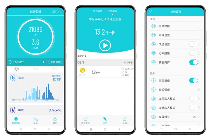 dido E55S Pro健康智能手表需要配合手机“H Band”APP使用,通过蓝牙连接,完成绑定后不仅可以对运动及睡眠、血压、血糖、心率等相关健康方面的数据进行记录,而且还可以在手机端APP内,对手表的信息提醒、闹钟设置、表盘设置、拍照等功能进行个性化设置。整体操控上简单便捷,即便老人操作起来也没有难度。