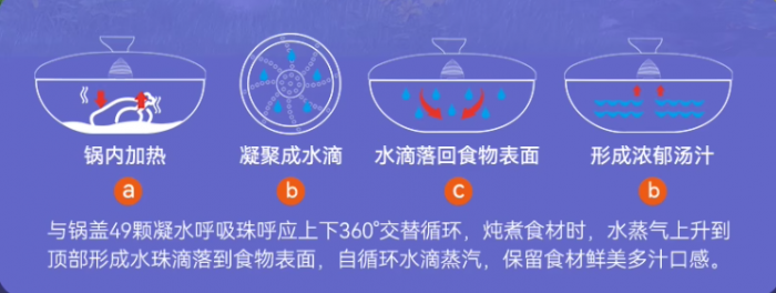 锅盖的设计也非常讲究,内侧有49颗凸起的凝水珠,模仿雨林花洒生态,内壁细孔与锅盖49颗凝水呼吸珠360°交替,形成蒸汽热循环,提高热效率,可完美替代珐琅锅。