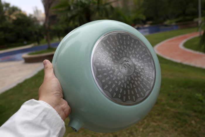 锅底部分可以看到帝伯朗在受热处专门设计了一块高纯度铝合金基底,采用了水波纹设计热效率提升3倍,在烹饪时中小火就能满足日常需求,保证内外同温。而且不挑炉具,煤气灶、电磁炉、陶瓷炉、电炉等都可以使用!
