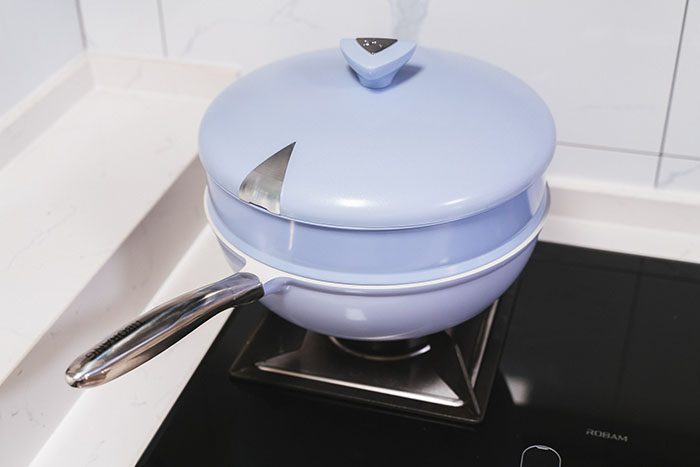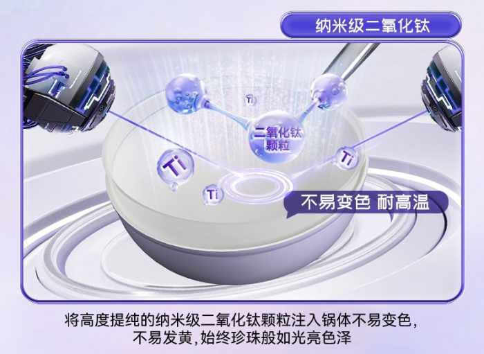 锅体采用了欧标EN601的标准打造,20年使用不会变形,同时锅身加入了高度提纯的二氧化钛,增加了锅体的不粘性,而且还不易变色发黄,同时还具备了纳米级的银离子,可以有效的抑制大肠杆菌、金黄色葡萄球菌,抑菌率达到了99.9%,时刻保证锅具的卫生安全。