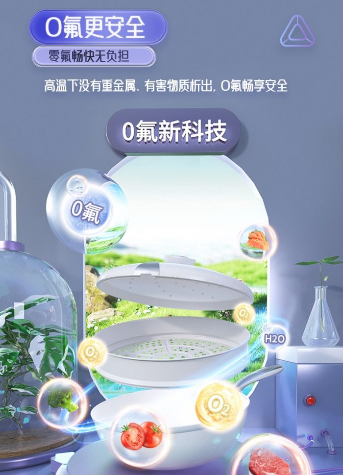 帝伯朗的这款最大的特点就在于它使用的材料了,首先是零氟这个概念,所有的材料中都是不含氟的,减少了在高温炒菜中容易出现致癌物的担忧。其次就是这款锅的内外壁都带有的特殊涂层。