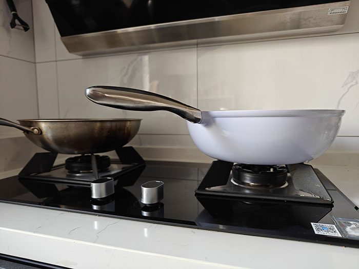 在说说外部涂层,很多炒锅的外部其实都没有涂层的,毕竟不太重要,但是帝伯朗这款氧吧锅的外壁也带有耐高温的涂层,大家可以看看我家之前的锅,外部已经烧的变色了,虽然不影响使用,但确实不太好看。帝伯朗外部带有的耐高温涂层,可以防止变色,氧化等,让锅的外侧也能保持光亮如新。毕竟谁不想要一个多年后也不黑不黄的锅具呢。