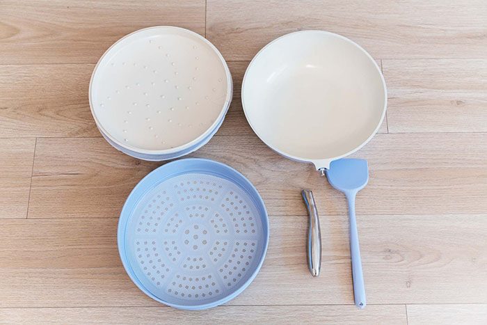 帝伯朗零氟氧吧锅除了锅体之外,还赠送了蒸屉、屉布和硅胶铲,蒸煮全套都可以,而且整体配色非常统一。