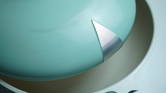 帝伯朗零氟氧吧锅整体设计偏向于圆润,但是锅盖把手和锅盖分别有一个非常有特色的设计,锅盖把手是一个三角形的设计,锅盖处也有一个三角形的设计,这个设计与这款锅的定位相关。帝伯朗零氟氧吧锅提出了三位一体的概念,从技术层面解决了粘锅、使用安全、使用寿命三个方面的问题,换句话说,帝伯朗零氟氧吧锅更不粘、更安全、更耐用。