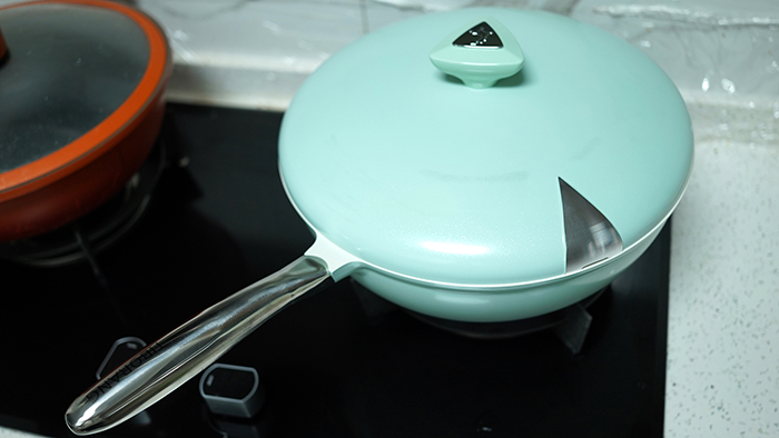 这款锅具配的锅把是经过了设计改良的,更能够符合国人炒菜时的握持习惯。