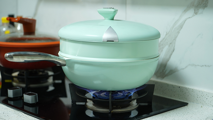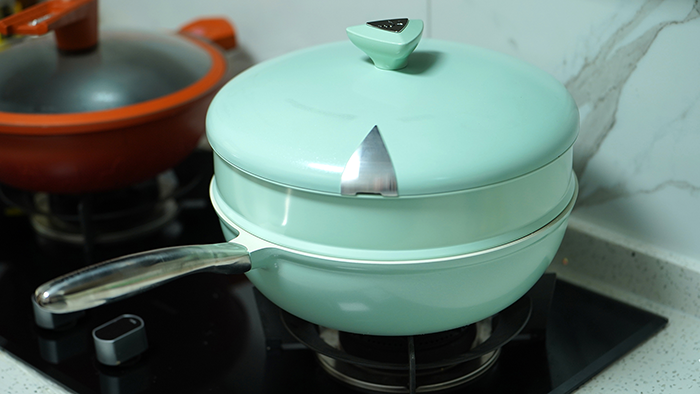 帝伯朗零氟氧吧锅最大的特色就是可以面对多种使用场景,炒、煎、炸、蒸、炖、焖、烤、煮。附赠的蒸笼解决了蒸等方面的需求。