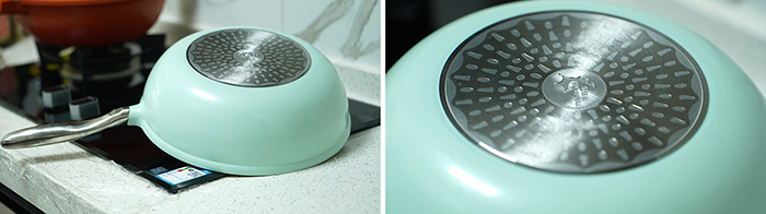 从侧视角度看,帝伯朗零氟氧吧锅是圆润风格,但是为了适应更多的场景,它在底部单独进行了水波纹复底,能够在电磁炉、燃气炉、瓦斯炉、电陶炉、电热炉等多种不同热源下使用。同时,这种材质与设计的锅底能够增加导热效率,日常用大火的烹饪只需要中小火就能完成,也起到一定程度的节能环保作用。
