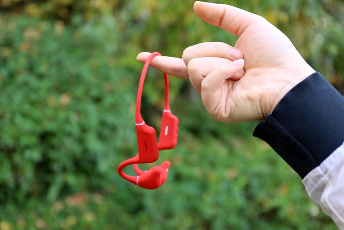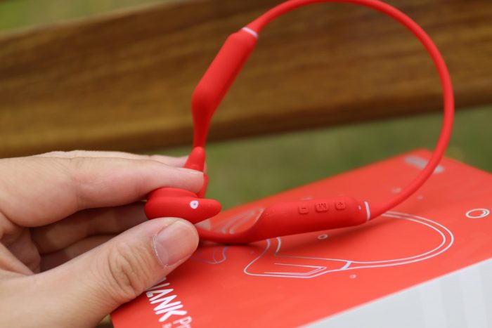 耳机表面采用了航空级硅胶工艺包裹,亲肤感十足,而且没有任何异味,重要的是这种材质挂在脖子上即使出汗也不会黏在皮肤上,很适合长时间运动佩戴。
