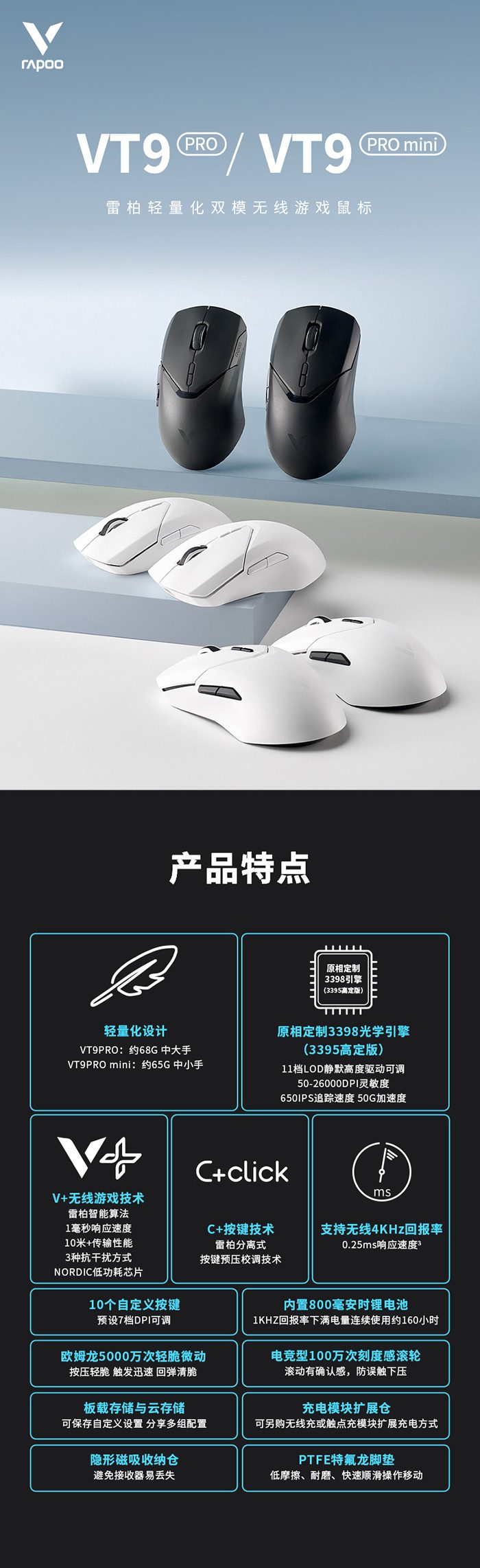 本次为大家带来“雷柏VT9PRO/VT9PRO mini双模4K无线游戏鼠标套装”的试用,一起来看看吧。 金测评希望你客观、专业、场景化的真实体验分享,而且众测报告必须是100%原创,抄袭将永久拉入黑名单。