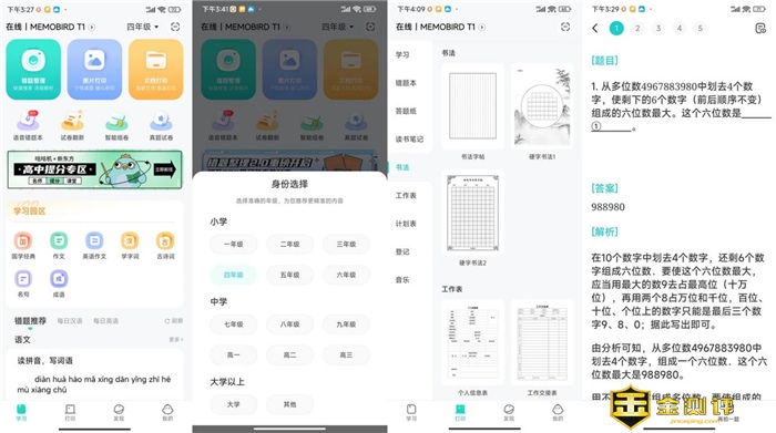 APP主界面上,咕咕机T1丰富功能看的更加清晰。且它可以选择年级,覆盖小初高所有学科,打印菜单栏还有很多可打印的模板,对错题整体拍照后还可以解析错题,同时举一反三给出同类型题目巩固练习。