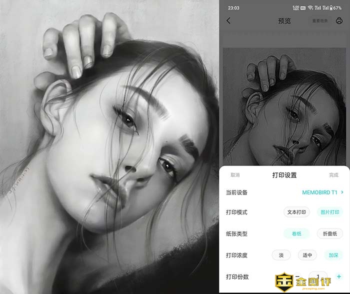 打文字肯定是小KS的,我们来看看打印图片的效果。随便在网上下载一张黑白的照片。直接打印试试效果,有意思的是,在APP里面,它会自动识别为图片打印,因此,我完全不用设置,直接打印即可,顶多调节一下浓度设置就好。