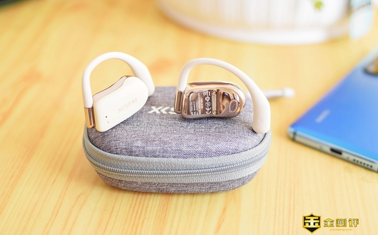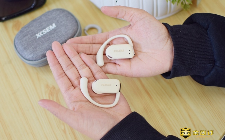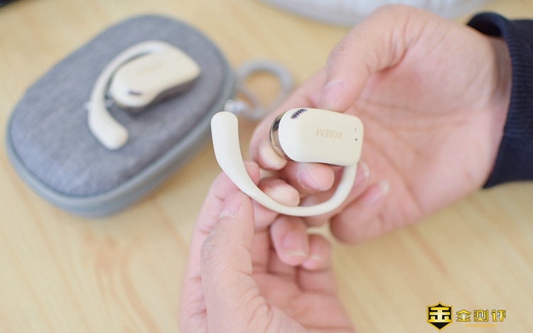 拉开拉链就能打开充电仓,耳机是耳挂式设计,采用了卡其色的配色,有点类似于暖白色,观感非常舒适,佩戴起来也是十分的典雅。