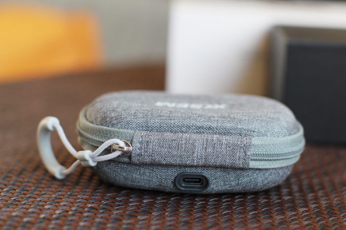 包装等我就不一一细说了,我们直接来看耳机。这款耳机的充电舱十分特别,它没有采用常见的塑料或是金属材质,而是在表面采用了织物材质,这样的好处是集收纳与充电舱功能于一体,不用担心放在包里会被磨花,摔一下也不会心疼,其实这应该是最耐用的设计了吧。