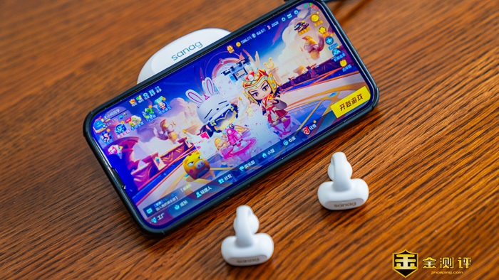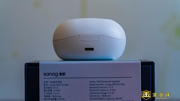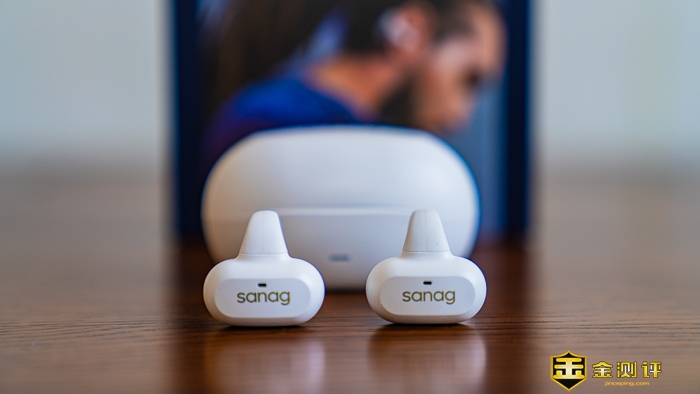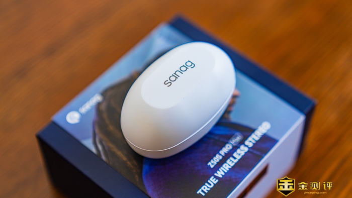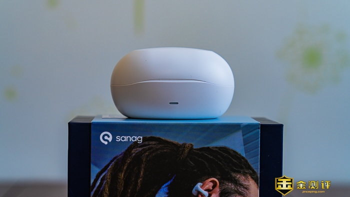 整个充电仓采用了椭圆形的结构设计,正面有sanag的英文LOGO。