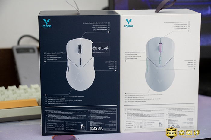 两款鼠标的包装设计相似,雷柏一贯的包装形式得以保留,包括美工元素。正面依旧是产品渲染图,能够直观清晰的了解鼠标的外观。